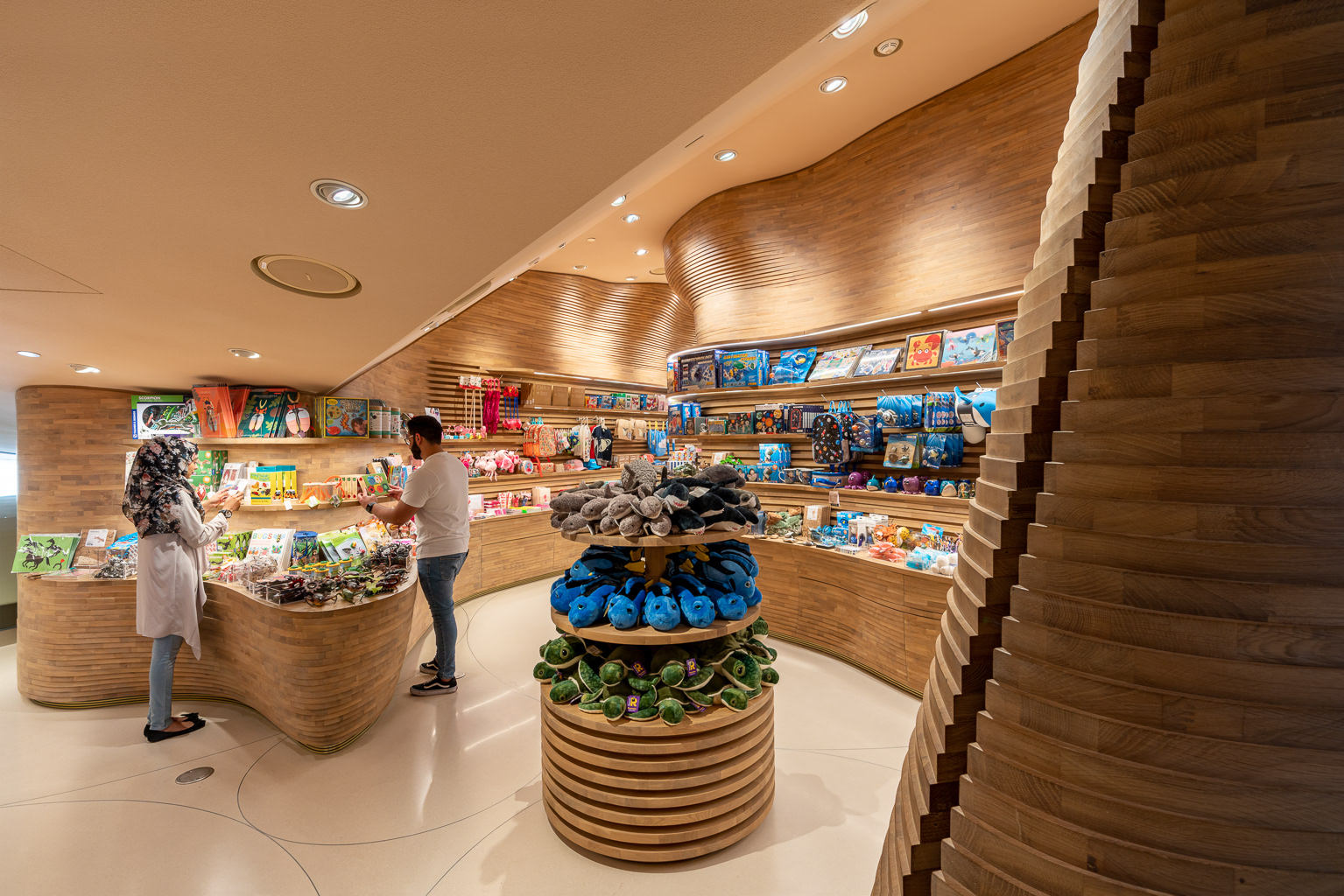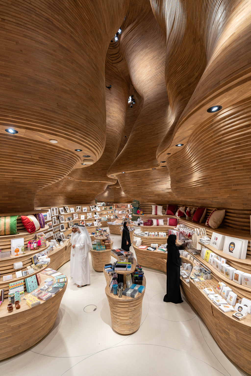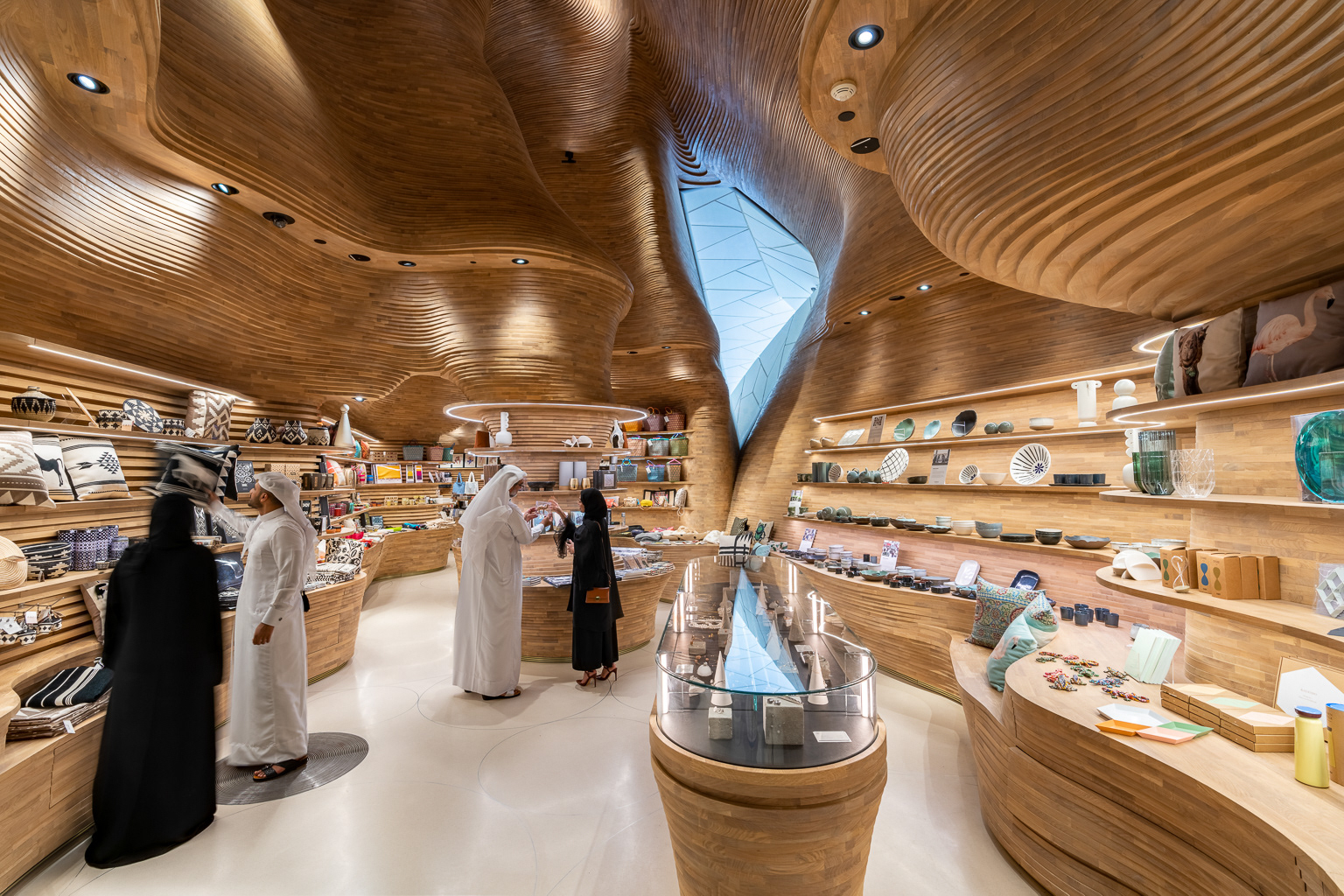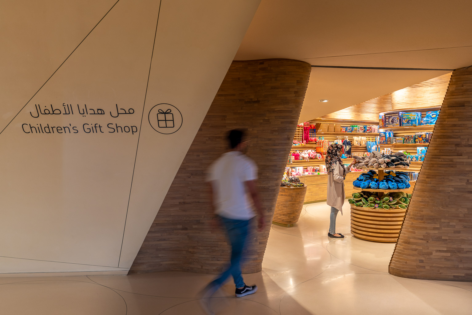 The museum gift shops impress with undulating timbered walls and ceilings that meander through the rooms like fine sand dunes. Forms from nature were transferred to the architecture and light from ERCO reinforces the dynamics of the flowing structure. Koici Takada Architetects were inspired by the light cave of Dahl Al Misfir. The 40-metre deep cave is a sanctuary in the heart of Doha and consists of fibrous gypsum crystals that glow with slight phosphorescence.