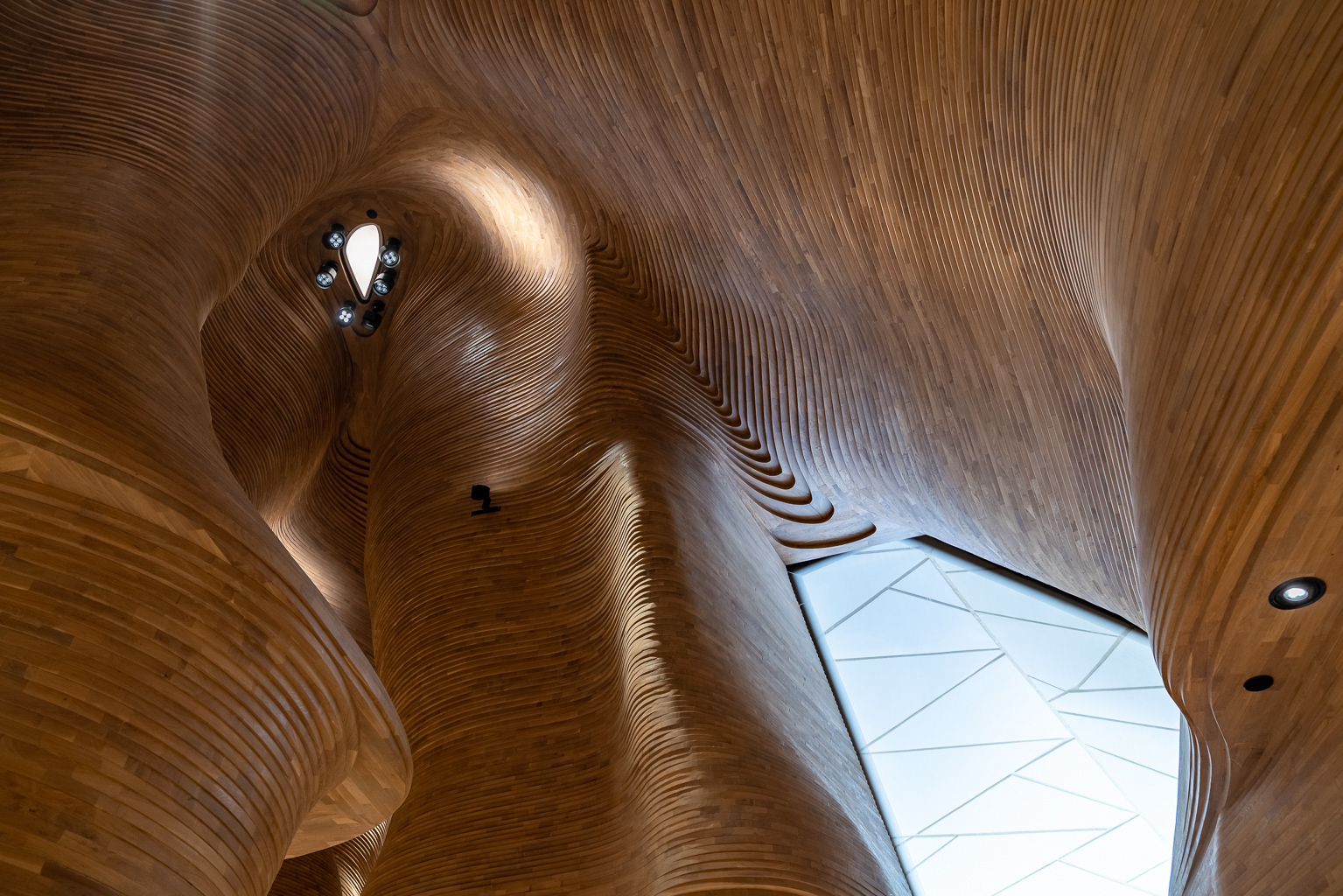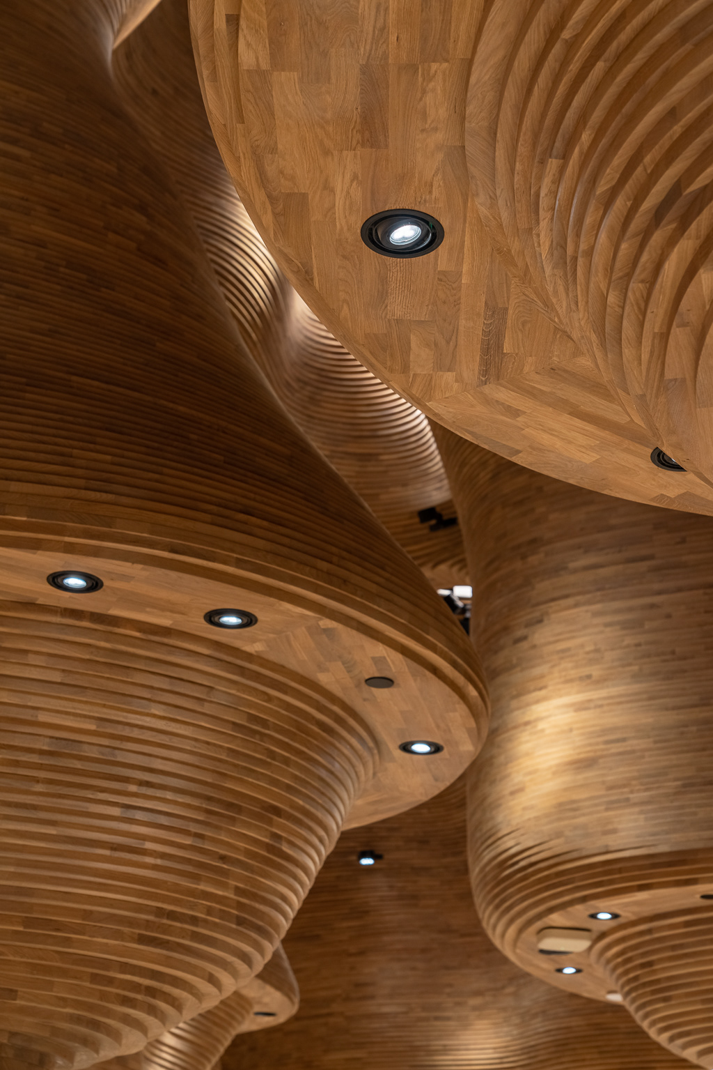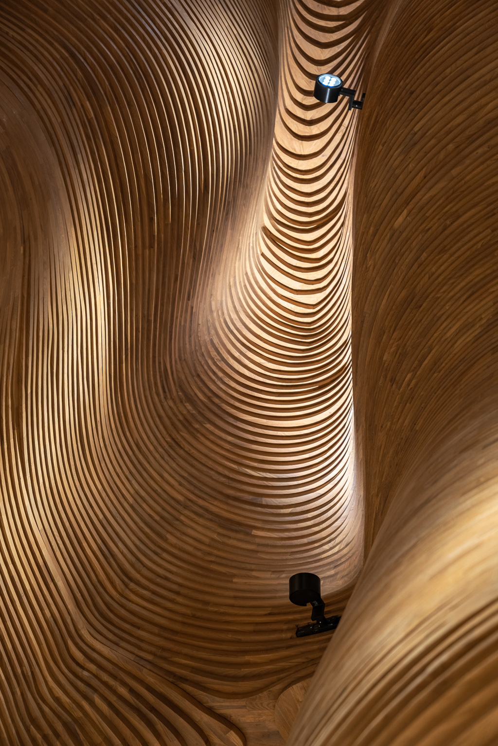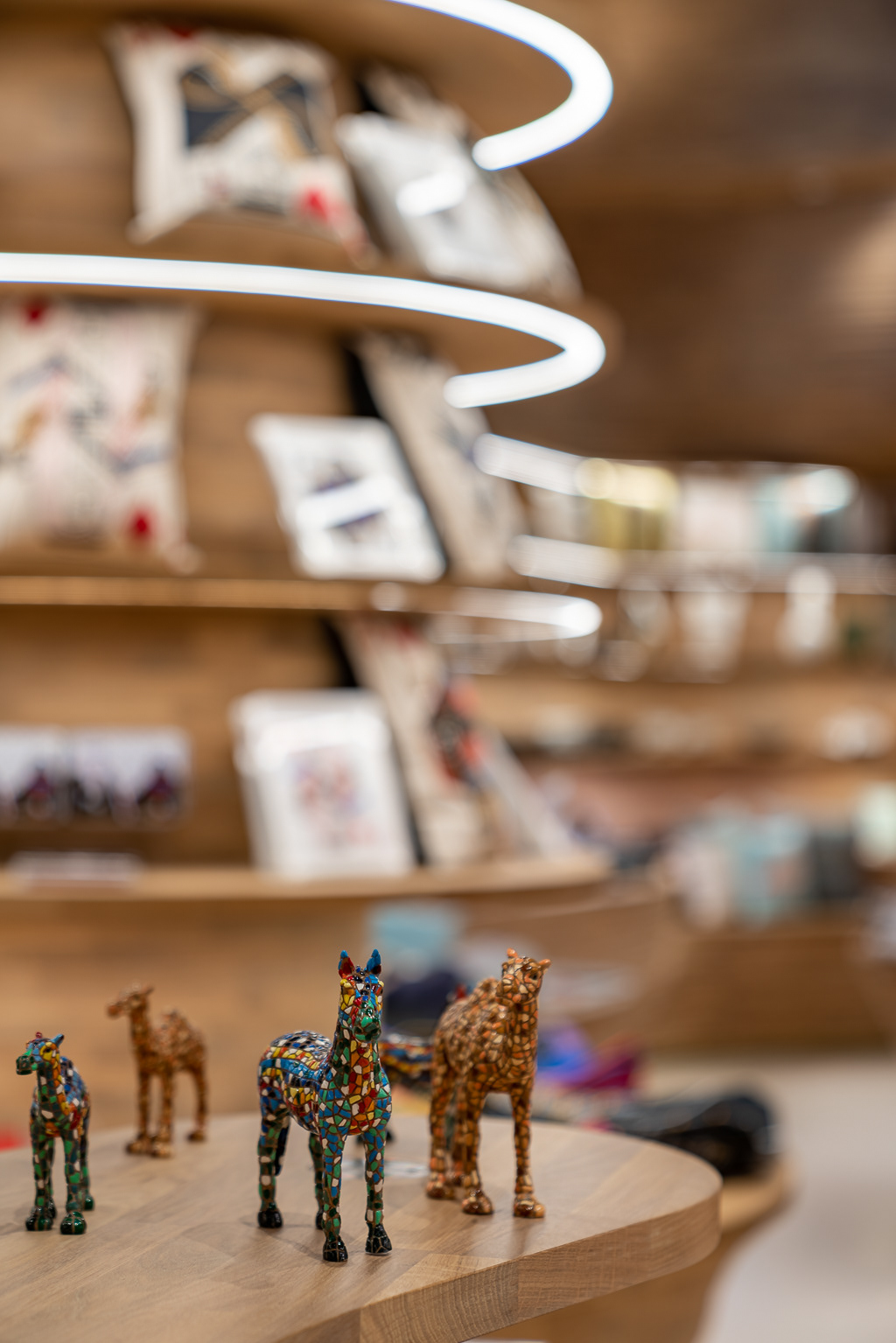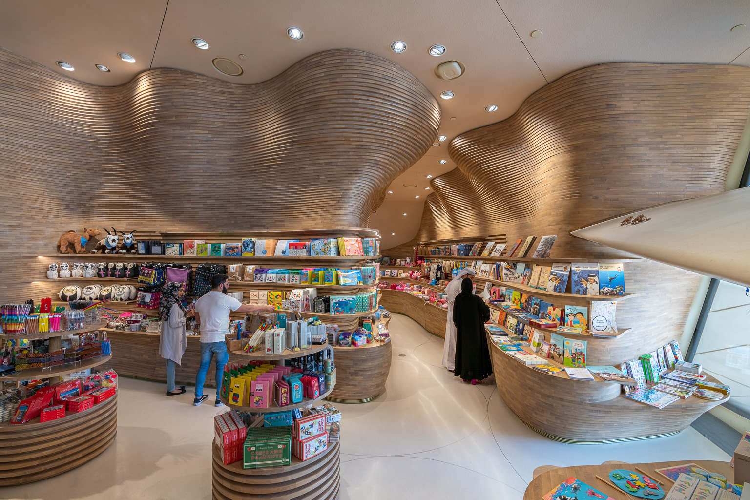 The museum gift shops impress with undulating timbered walls and ceilings that meander through the rooms like fine sand dunes. Forms from nature were transferred to the architecture and light from ERCO reinforces the dynamics of the flowing structure. Koici Takada Architetects were inspired by the light cave of Dahl Al Misfir. The 40-metre deep cave is a sanctuary in the heart of Doha and consists of fibrous gypsum crystals that glow with slight phosphorescence.
