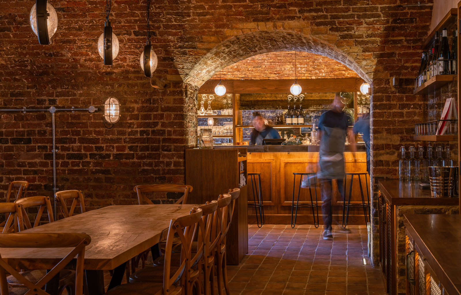 The Drop wine bar is located within three connected arches at the Bangley Walk Arches. The site is overlooking the main Coals Drop Yard plaza and Plaza Pastor. In good weather the foldable shop front allows the arches to be opened entirely, creating the effect of an outdoor space.